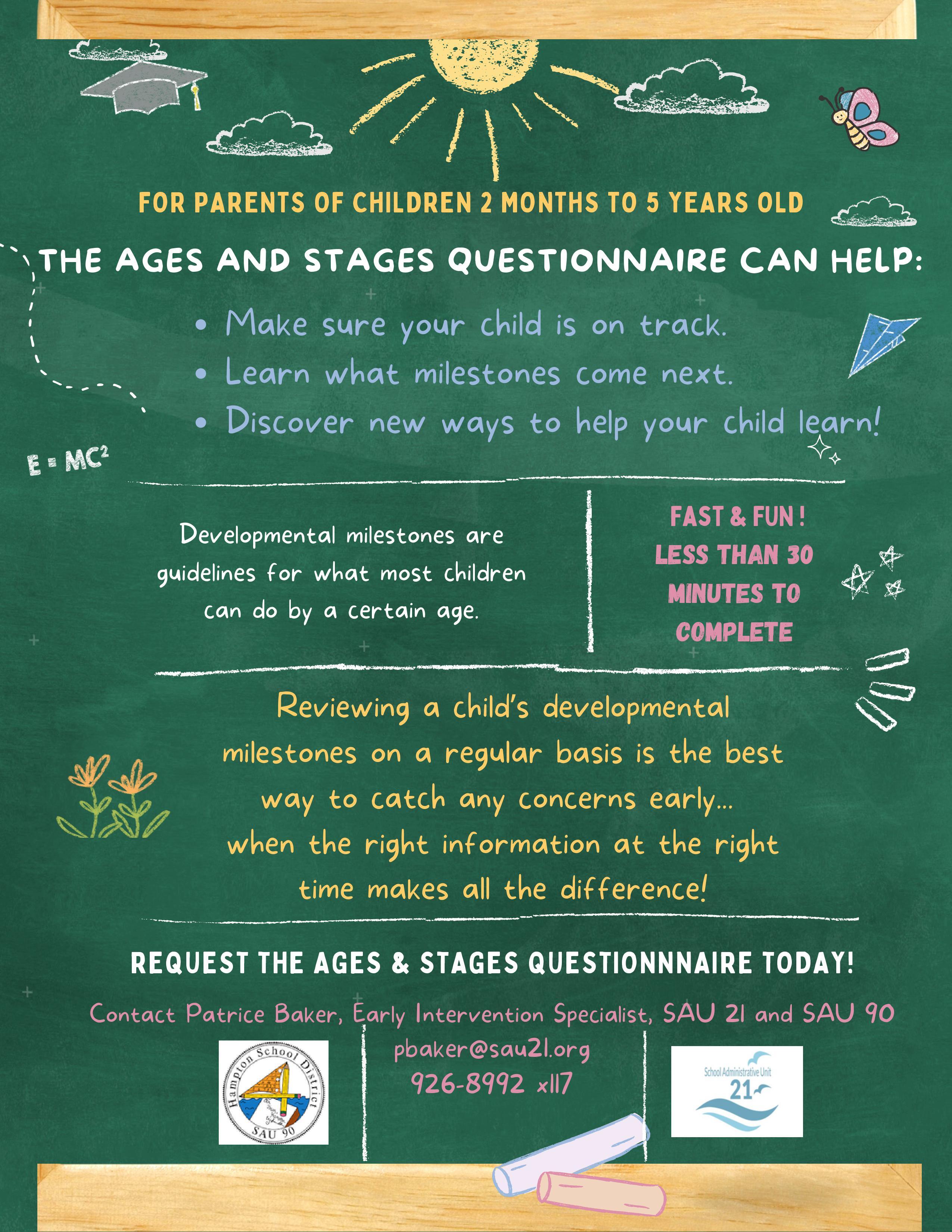 School Administrative Unit 21 actively tries to locate any un-served children with educational disabilities (or with suspicion of educational disabilities), who reside within the SAU 21 school districts. We are interested in any children, age 0-22 who may have mental, emotional, or physical limitations. We may be able to provide services that could make a lasting difference for these children through referring, identifying, and evaluating their needs. If you are aware of any un-serviced children, please bring them to our attention by contacting Patrice Baker at 603-926-8992 x 117 or pbaker@sau21.org